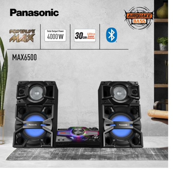 Con un superwoofer de 30 cm con AIRQUAKE BASS, woofer de 20 cm y tweeters de 6 cm, el SC-MAX6500 de Panasonic produce sonidos robustos de bajos que puedes sentir de la cabeza a los pies. Y la iluminación MAX Dance aumenta el estado de ánimo con efectos de iluminación. La unidad principal está equipada con dos entradas de micrófono y una función Full Karaoke